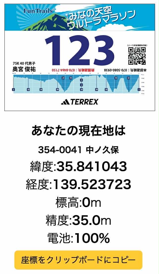 ![]() | 位置情報の報告手順 ①ナンバーカードのQRコードをスマホのカメラで読み込んでください。 ②https://kzi.jp/gps.htmlをタップ。 ③あなたの現在位置が表示されます。 ④「座標をクリップボードにコピー」を押し ⑤ナンバーカードに記載されている携帯番号にショートメールで送信してください。 ・本部連絡先→ロストなどコース上で困ったとき ・救護連絡先→疾病、怪我などのとき |